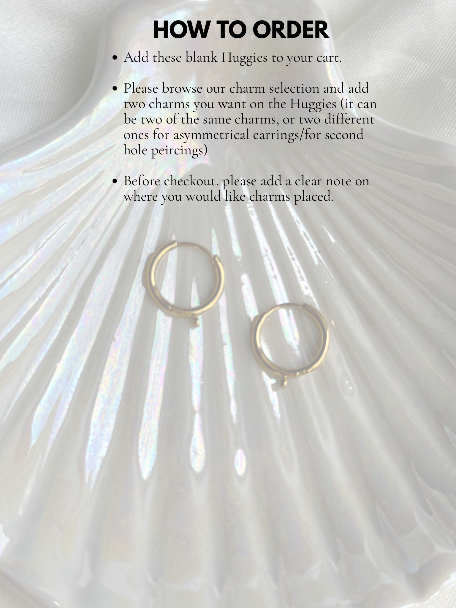 Create your own huggie hoops! Please browse our CHARMS section and purchase *TWO* of your choice; feel free to mix and match for asymmetrical hoops or, of course, two of the same charms.