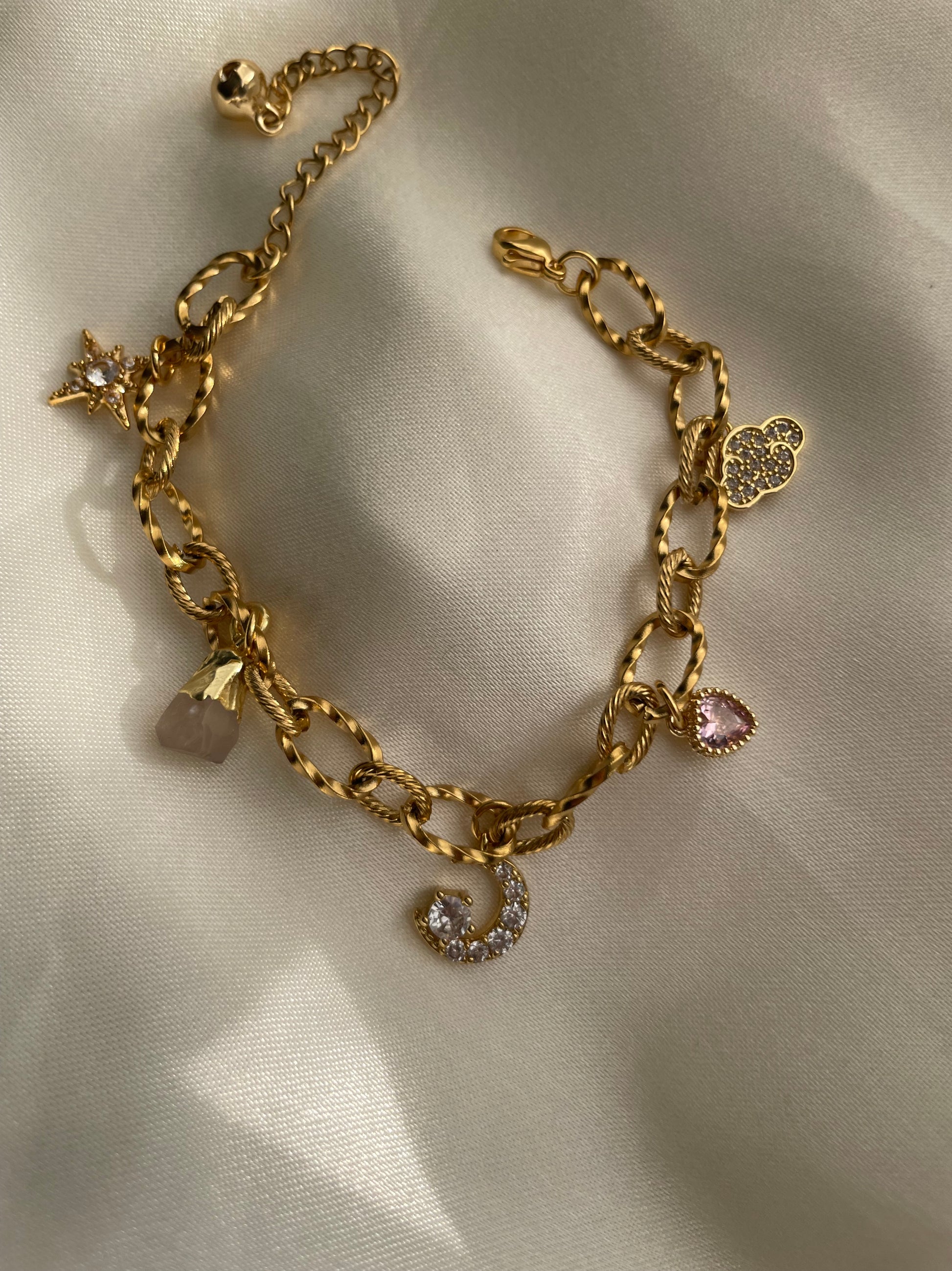 - charms are a mix of gold plated brass + stainless steel